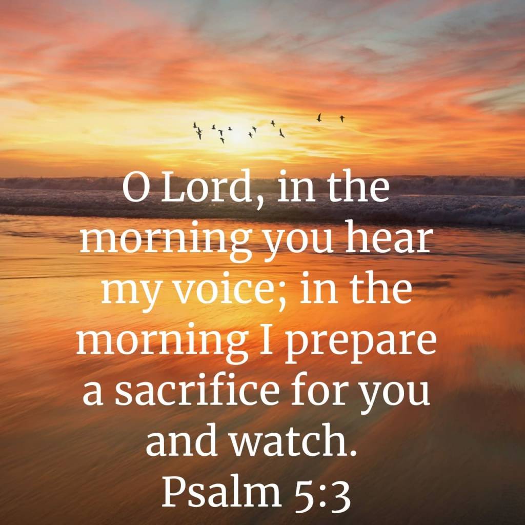 My daily Bible reading brought me to Psalm 5 today, and in it, verse 3, which says, “O Lord, in the morning you hear my voice, in the morning I prepare a sacrifice for you and watch.”